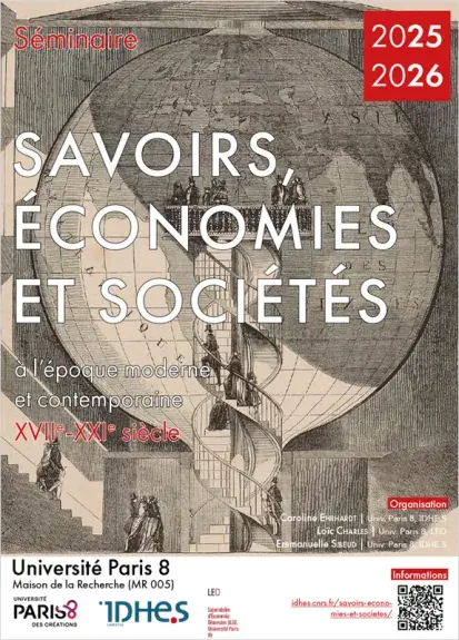 Au carrefour de l’histoire sociale, de l’économie et de l’histoire des savoirs, ce nouveau séminaire réunit les chercheur·es et les doctorant·es de l’équipe Institutions et Dynamiques Historiques de l’Économie et de la Société (UMR 8533) à Paris 8 et de l’axe “histoire” du Laboratoire d’Économie Dyonisienne (UA 3391). Les séances sont basées sur une présentation d’une recherche en cours sur la période moderne ou contemporaine. Elles seront l’occasion d’explorer ces sujets dans une perspective globale et résolument pluridisciplinaire.